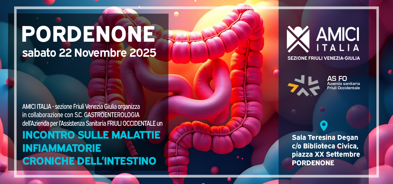 La Sezione Friuli Venezia Giulia di AMICI Italia, in collaborazione con l’Azienda Sanitaria Friuli Occidentale (ASFO), organizza un nuovo appuntamento dedicato al dialogo tra pazienti, medici e professionisti sanitari sulle Malattie Infiammatorie Croniche Intestinali
