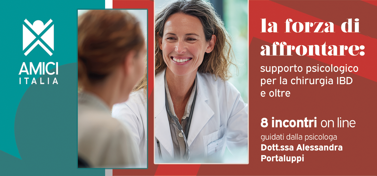 Affrontare un intervento chirurgico quando si convive con una Malattia Infiammatoria Cronica Intestinale può generare molte domande, paure e cambiamenti emotivi. Per accompagnare i pazienti in questo momento delicato, AMICI Italia propone un percorso di supporto psicologico online dal titolo “La forza di affrontare: supporto psicologico per la chirurgia IBD e oltre”, guidato dalla psicoterapeuta Dott.ssa Alessandra Portaluppi.