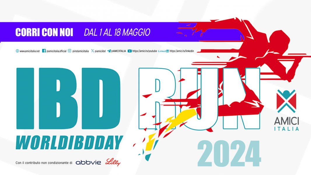 In occasione della Giornata Mondiale 2024 siamo felici di riproporre l'iniziativa IBD Run, un movimento che coinvolge pazienti affetti da Malattie Infiammatorie Croniche dell'Intestino, medici, infermieri, rappresentanti delle aziende farmaceutiche e rappresentanti delle Istituzioni, con l'obiettivo di sensibilizzare l'opinione pubblica sull'importanza del movimento nella gestione di queste patologie.