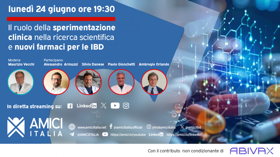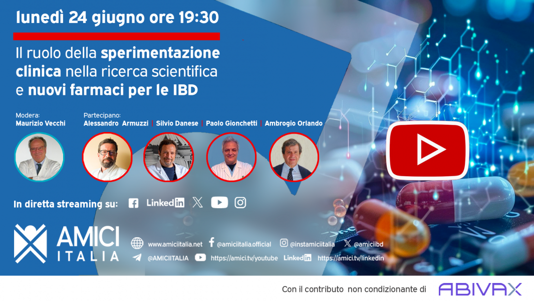 Webinar "Il ruolo della sperimentazione clinica nella ricerca scientifica e nuovi farmaci per le IBD", lunedì 24 giugno a partire dalle ore 19:30 in diretta streaming su YouTube, Facebook, Twitter, Instagram e LinkedIn
