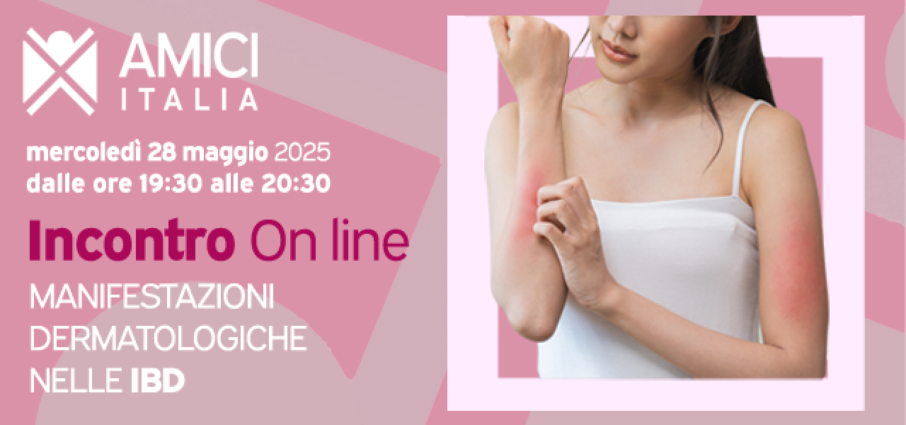 AMICI ETS è lieta di invitare pazienti, caregiver e operatori sanitari all’incontro informativo “Manifestazioni Dermatologiche nelle IBD”, che si terrà mercoledì 28 maggio 2025, dalle 19:30 alle 20:30, in modalità online.