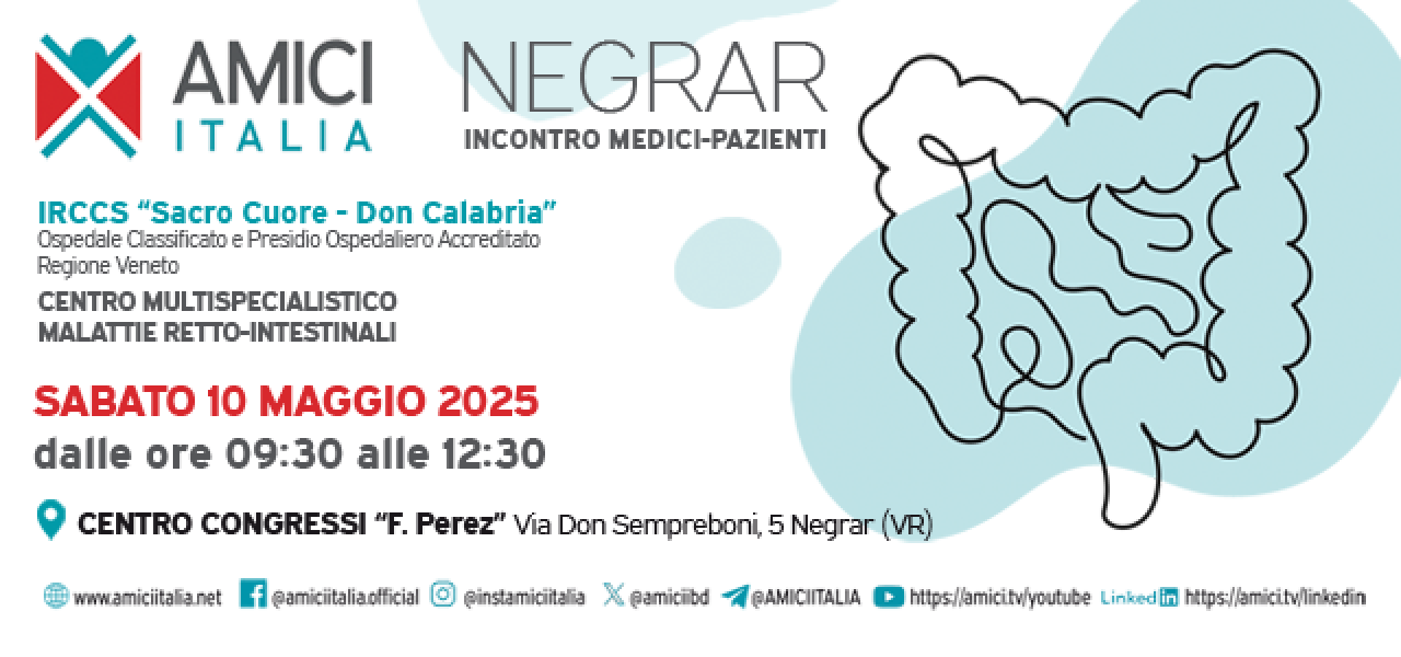 Sabato 10 maggio 2025 si terrà a Negrar (Verona), presso il Centro Congressi “F. Perez” dell’IRCCS Sacro Cuore Don Calabria, l’incontro medici-pazienti organizzato con il supporto di AMICI Italia